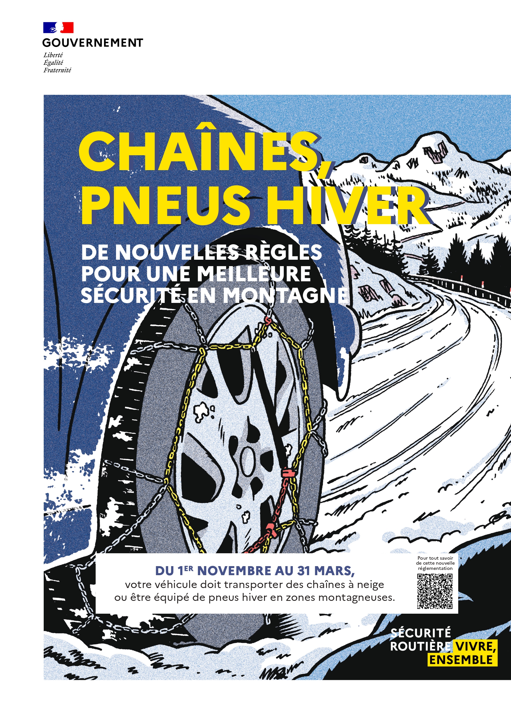 Si vous traversez des communes de montagne des massifs montagneux (Alpes, Corse, Massif central, massif jurassien, Pyrénées, massif vosgien), dans un des 34 départements soumis à l’obligation, votre véhicule doit disposer, selon la réglementation en vigueur, du 1er au novembre au 31 mars, au choix :